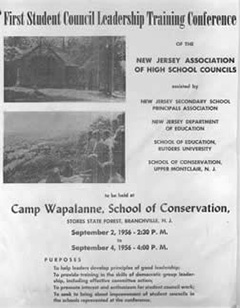 The first NJAHSC Leadership Training Conference (LTC) was held from September 2-4, 1956 at Camp Wapalanne, Stokes State Forest in Branchville, New Jersey. About 130 student delegates representing seventy-five high schools and junior high schools participated and then returned to their schools with high praise for the experiences they enjoyed at camp.